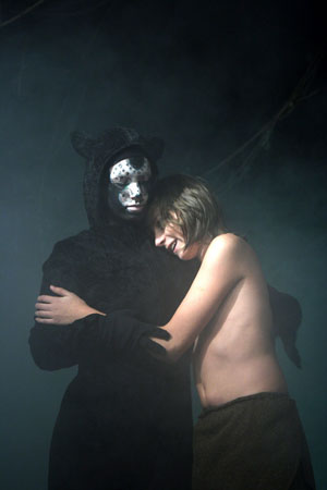 Videoeinspielungen wie, Flugszene, Schlangenauge, Blitz, Feuer und Teichszene ergänzten das Bühnenbild.